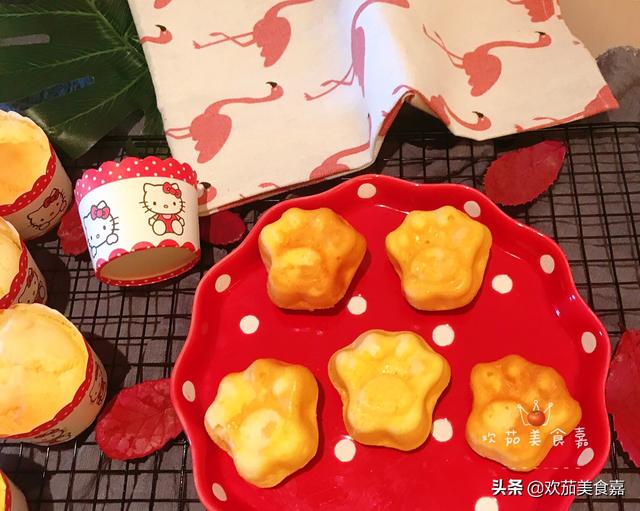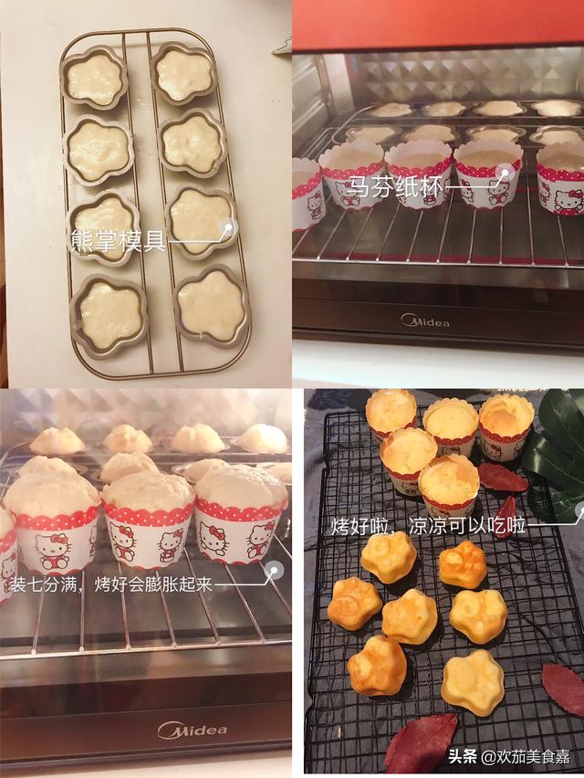 10、将蛋糕糊装入几个马芬纸杯中,7分满就好。装好后轻轻震动几下,消除气泡。家中若有其他小烤盘模具的话也可以直接将蛋糕糊装入烤盘模具里。我自己就同时用了熊掌模具,做了几个熊掌小蛋糕。