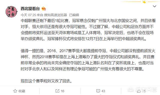 国安即便只是理论上有夺冠可能,那也不能提前人为确定冠军归属,把奖杯直接送广州就是对国安的不尊重。去年并不存在这个问题,倒数第二轮上港已确保夺冠,且是最后一个主场,庆典不放在上海又放在哪里?恒媒这几天一直为这些鸡毛蒜皮喋喋不休,他们最好是第一轮就把奖杯送到广州,真是小肚鸡肠到极点!