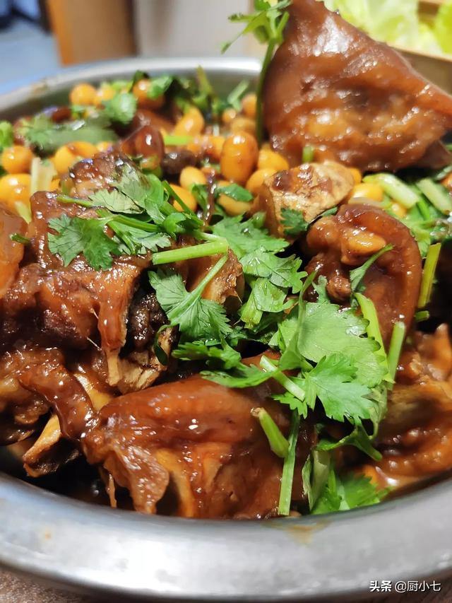 红烧猪蹄,加上黄豆,大火烧开中火焖,一个小时能出锅,撒点香菜碎。