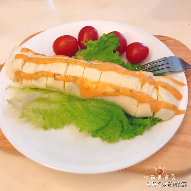 9、摆盘,挤上孩子喜欢的酱料,我是用的千岛酱。搭配上绿蔬和小西红柿。孩子真的很喜欢吃呢!