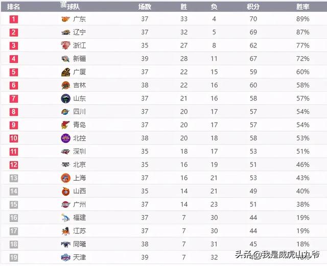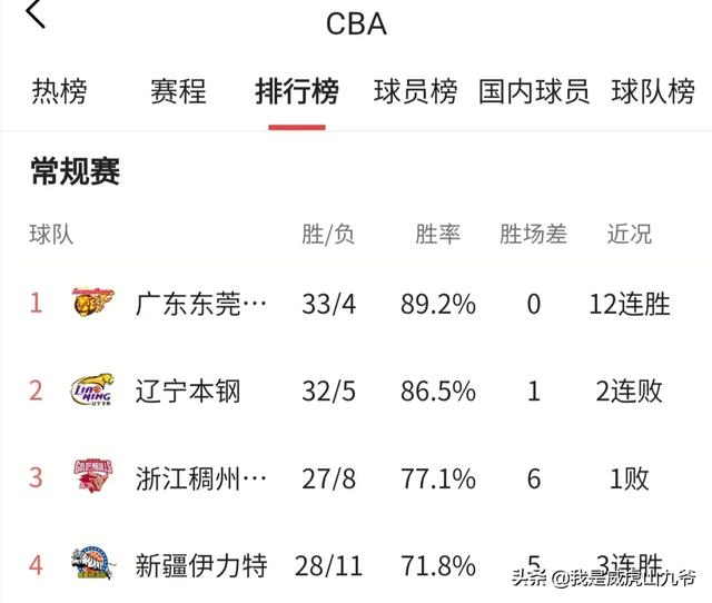 CBA第二阶段常规赛已经结束,进入短暂的休赛期。卫冕冠军广东凭借一波12连胜,重新拿回了积分榜榜首位置,目前战绩为33胜4负,领先第二的辽宁一个胜场。