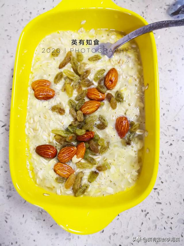 4、一根香蕉切片铺到燕麦上,并洒入果干及干果