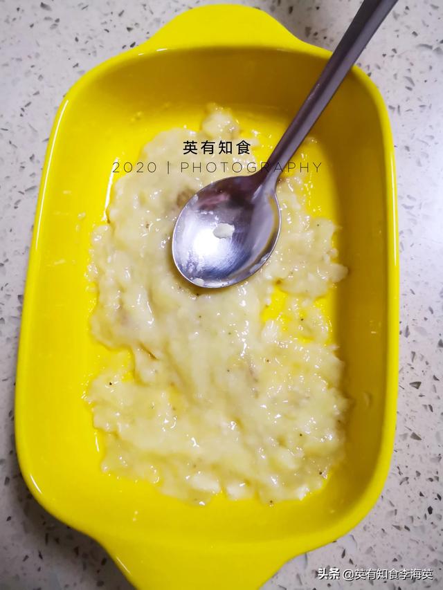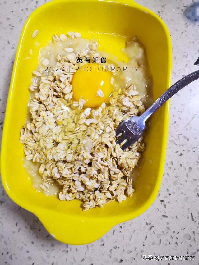 1、香蕉一根压泥,放燕麦片,打入一颗鸡蛋,用筷子打散并搅拌均匀
