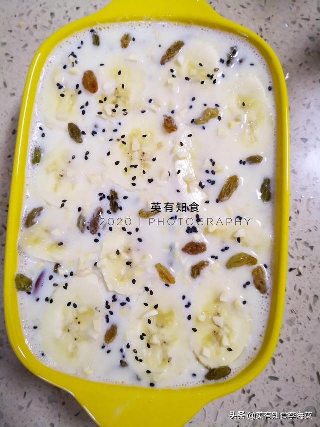 食材:香蕉2根,燕麦片,牛奶,鸡蛋,干果果干等