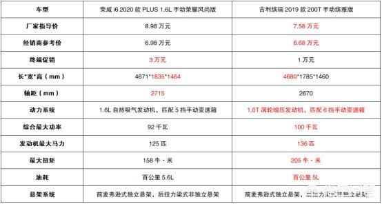 因此,我们选取了“荣威i6 2020款PLUS 1.6L手动荣耀风尚版”和“吉利缤瑞2019款200T手动缤雅版”来进行比较一番。