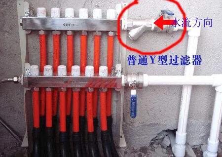 - 第三个过滤器堵塞。在地暖系统的分水器进水管处,一般会设置Y型过滤器,这个过滤器主要是过滤系统内的污物杂质,水垢等,防止进入地暖盘管内。我们的采暖系统避免不了会产生水垢,铁锈,焊渣等杂质,过滤的多了这个过滤器就会发生堵塞。从而也会导致水流不畅,出现进水管热回水管凉的情况。