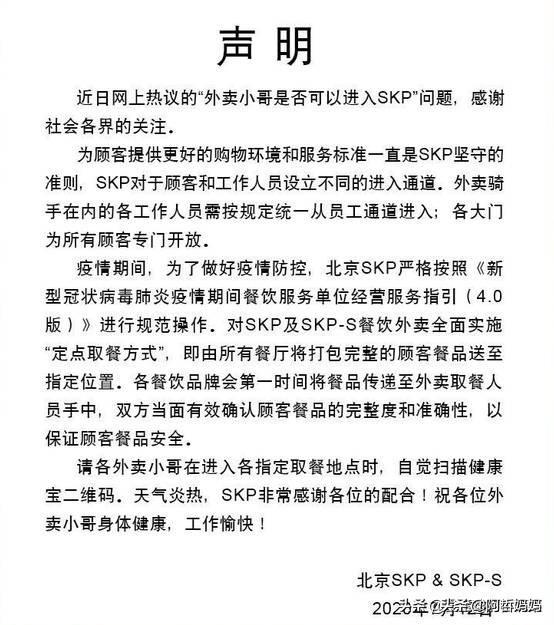 而商场因为有取餐的需求,所以,不可能禁止外卖员进入。可很多商场也都会规定一些外卖员专门的通道,专门的楼层,只有SKP的管理,可能是比其他商场严格一些,到位一些。我认为这无可厚非,如果说保安不能解释到底外卖应该怎么走,那肯定是保安岗位培训没有到位。人家SKP设立了专门的外卖小哥等候的区域,也是合理的规定。这样做不是为了歧视外卖,而是为了顾客不受影响。
