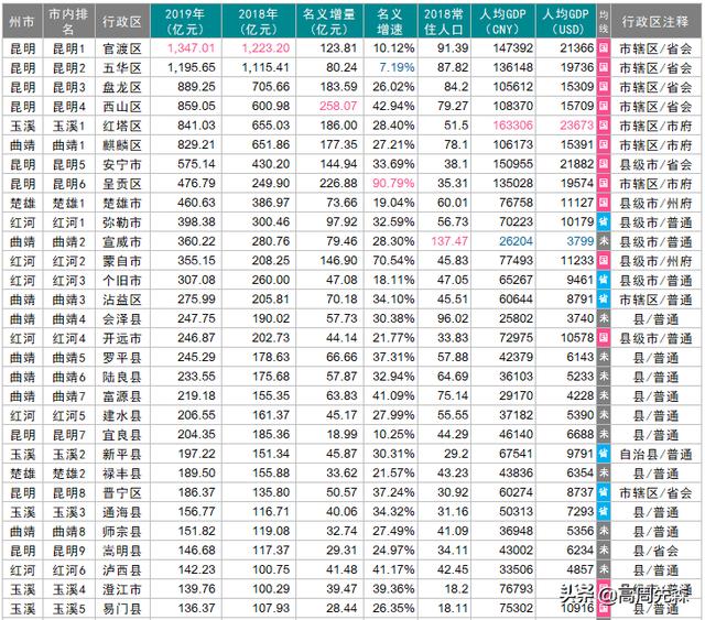 云南比较强大的地方集中在滇中,GDP总量大,人均也相对高点,我说的包含所有的区,县级市,排名不分先后。
