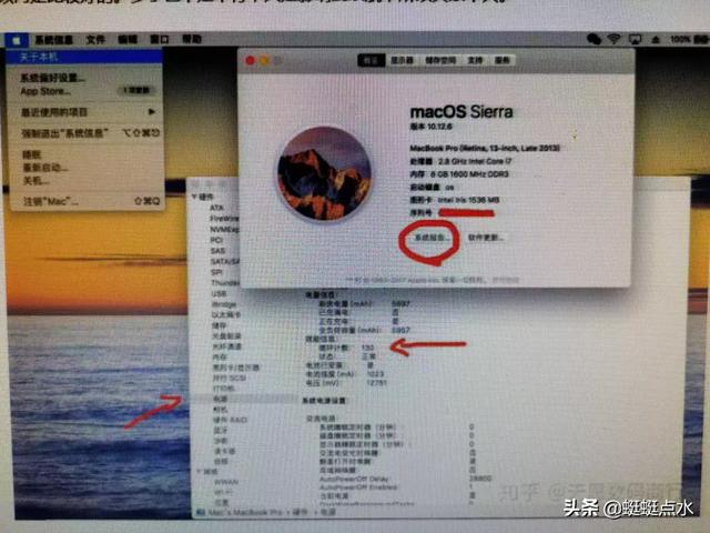 第六呢,就是检查一下他的蓄电池。还有摄像头。蓄电池,主要检查一下使用循环次数。这个在桌面的苹果图标上点一下再点击关于本机,就会出现一个页面,再点击系统报告。那里边找到电源选项,查看一下蓄电池的使用次数。摄像头只要查看一下是否可以正常使用就可以了。