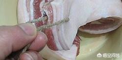 3、在肉的一端穿一个洞,穿上麻线后把肉挂起晾干,大概3个小时