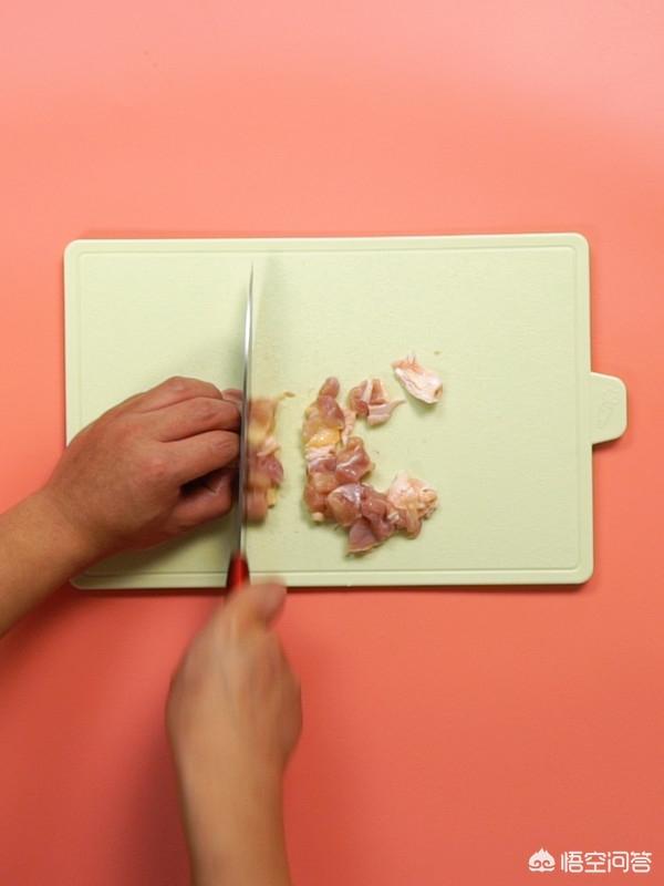 葱白、蒜末切断,姜片少量,鸡腿肉切丁