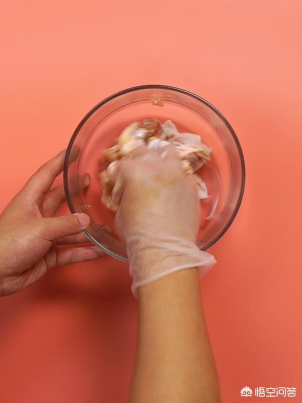 倒入鸡腿肉,盐,水豆粉,抓匀,放入生抽抓匀腌制
