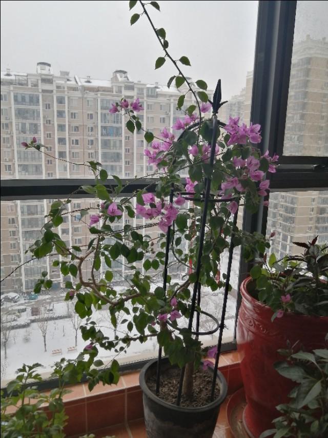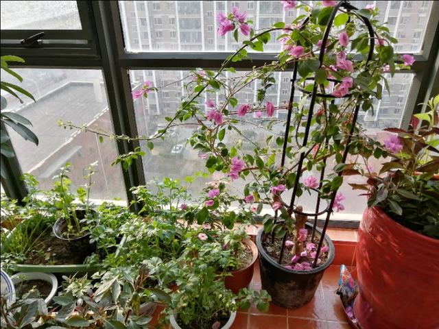 建议养一颗爬藤类的如颜色鲜艳的三角梅,爬藤在阳台护栏一定很漂亮,还省事不着虫,再养一盆穿心莲还能当菜吃呢