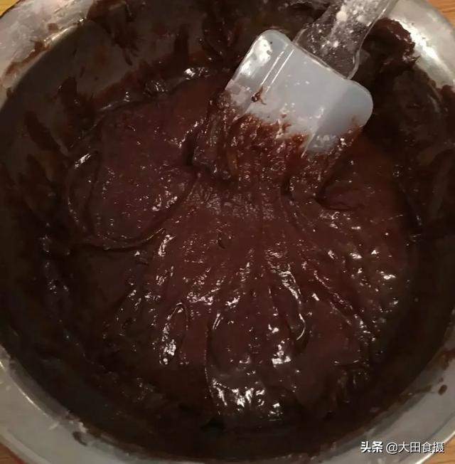 2、将鸡蛋、牛奶、泡打粉、糖、盐、巧克力粉和化好的黄油充分混合,搅拌至顺滑。