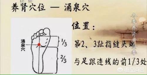 2:揉涌泉穴。盘腿端坐、赤足,用手拇指按压左右涌泉穴(足底前1/3凹陷处)。有治疗腰膝酸软、消除疲劳的作用。可以使气血通畅,有温补肾经、补肾固精的作用。