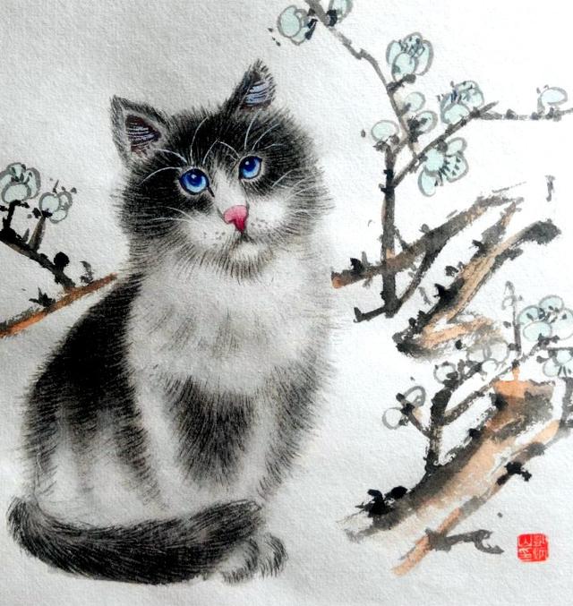 短点丝。附以前仿曹克家笔法画的两幅貓画。因平时较少画.方法掌握得不够熟练,有兴趣者可寻曹克家的作品(荣宝斋画谱中有曹克家的一本)作学习范本。