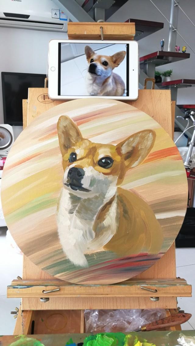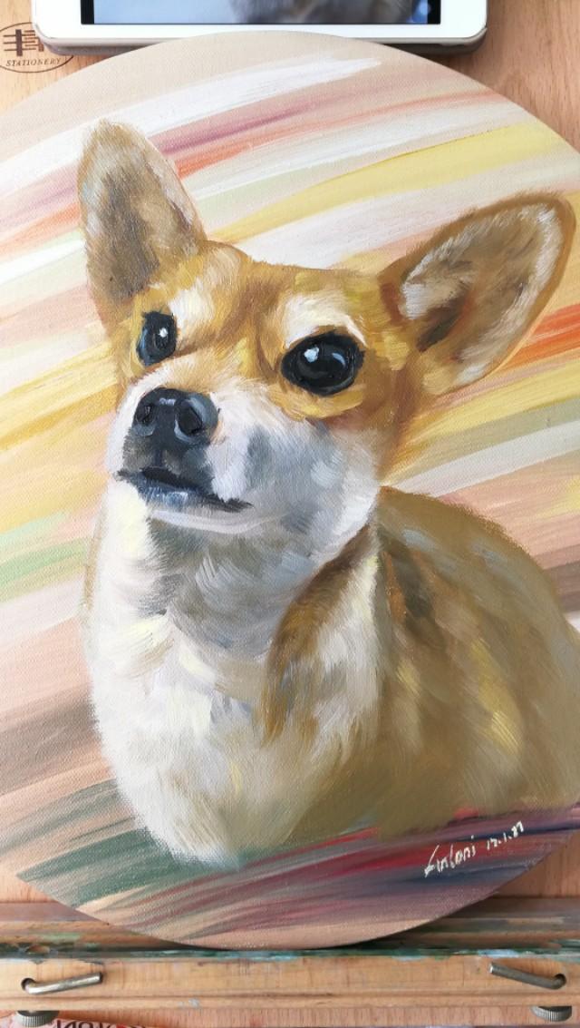 这是我画的第一幅动物油画,我家的小狗。开始铺完整个颜色的时候也是有很明显的笔触(如下图),后来花了几分钟用干燥的有点分叉的毛笔在毛发部位来回轻轻的蹭了几次,笔触感降低很多,毛发的感觉变强烈了些(如上图)。