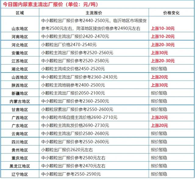 从11月8日尿素厂家价格调整来看,部分地区持续上涨。其中,山东地区每吨再涨10-30元,出厂价格涨至2440-2500元左右;河南地区每吨上涨10-20元,主流出厂价格涨至2428-2470元;河北地区每吨上调20-30元,主流出厂价格每吨在2470-2540;安徽地区每吨上涨30元,出厂价格每吨在2520-2560元;江苏地区每吨上涨20-30元,出厂价格每吨在2520-2580元;山西地区每吨上涨20元,涨至每吨2360-2430元;陕西地区每吨上涨30元,出厂价格每吨涨至2400-2500元。其它地区价格请看下表: