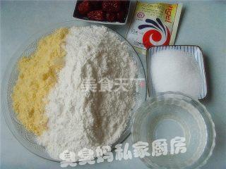 1材料:面粉200克、细玉米面100克、泡打粉3克、酵母3克、白砂糖30-40克、温水110ml、干红枣若干。