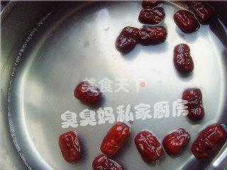 5干红枣洗净,泡20分钟后,倒入煮锅里,加水煮5-10分钟。