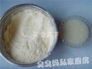 2将面粉、玉米面、糖、泡打粉先在盆中混合均匀;酵母融化于温水中。