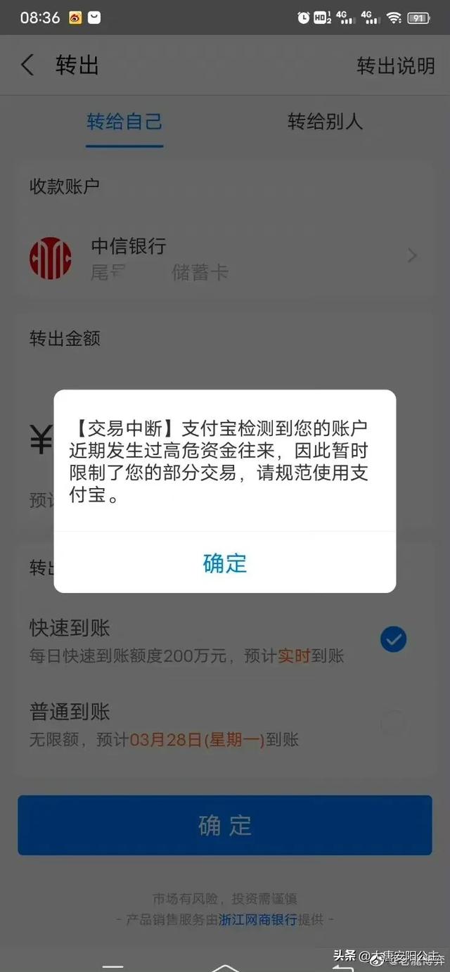千万不要把钱放到支付宝,支付宝限制提现,早上我从支付宝提出十万到银行卡,后来不用我就放回去了,等我再次往出提钱的时候,就说检测到我的账户有风险(提现银行卡是我自己银行卡,不是第一次交易),不让我提现,找平台客服,客服直接给我拉黑,不管我说什么,都是自动回复。