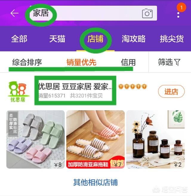 首先,你要分清楚自己的需求是什么,如果只是买些日用品和居家装饰类的东西,或者想要打听在这个领域哪家店铺做的好,可以在某宝上搜索“家居”二字,然后选择店铺,进行搜索,出来答案后可以根据你想了解的情况,分类看店铺排名。比如销量和信用排名等。如下图: