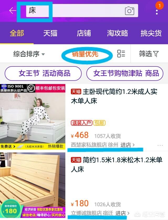 其次,如果你想要购买的是家具或者电器类的,你可以在某宝首页直接进行产品或者与之相关的店铺搜索。根据排名可以看到店家信息。如下图: