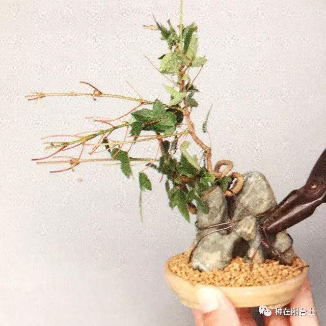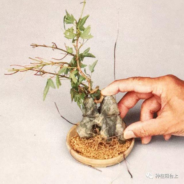 步骤二:用金属丝将两棵树苗绑在石头上。为了不让树苗挡住石头,建议将树苗绑在石头的后面。