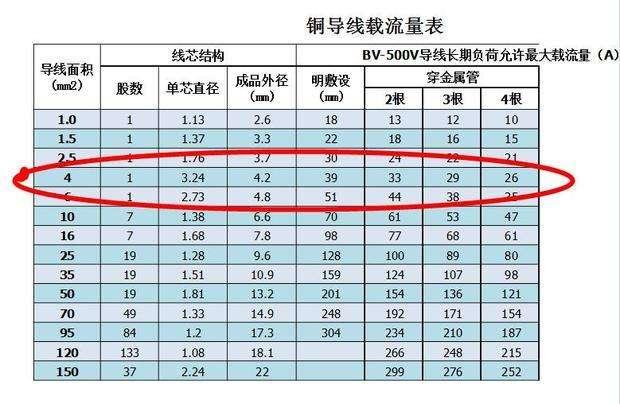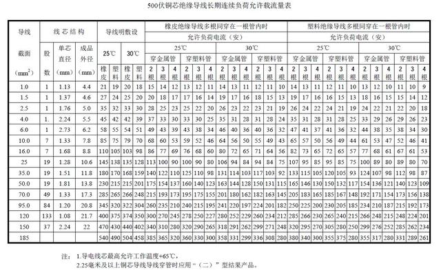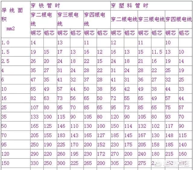 这个表的优点是好记,1-16平方分别用10-4的倍数乘平方数就得出载流量,铜线升一级,墙中穿管降一级。