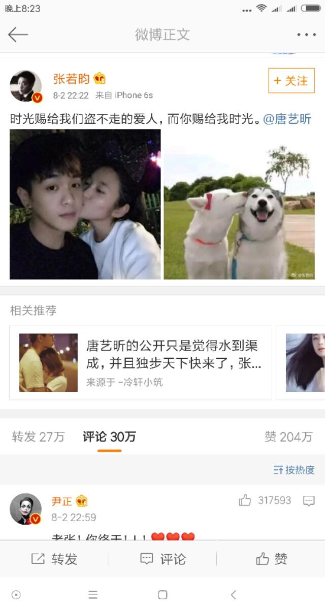 昨日深夜,张若昀突然发了一条微博,时光赐给我们盗不走的爱人,而你赐给我时光。并且圈了一下唐艺昕,正式公开恋情,截止目前,该条微博点赞数已达204万,引爆网络。