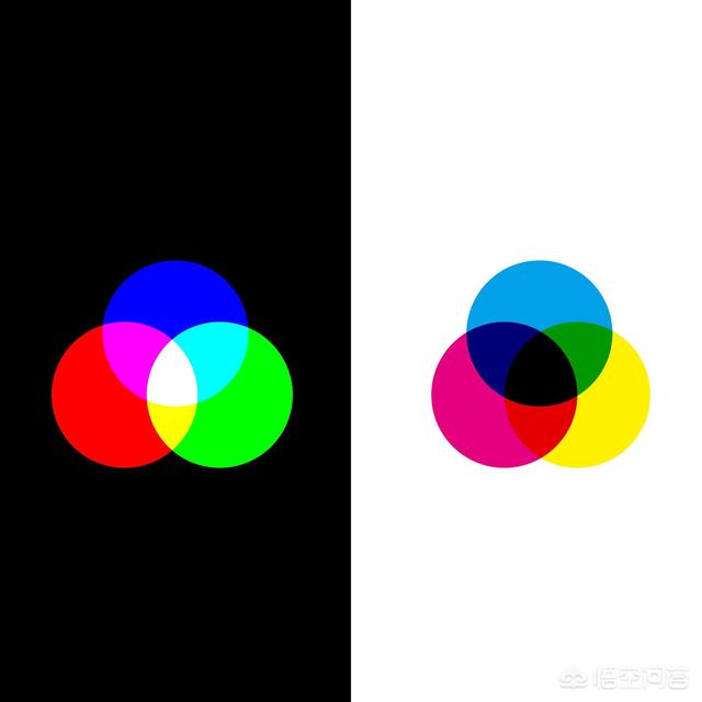 红黄蓝与红绿蓝分别是颜料的三原色与光的三原色,颜料的三原色混合之后是黑色而光的三原色混合之后是白色。如图所示:
