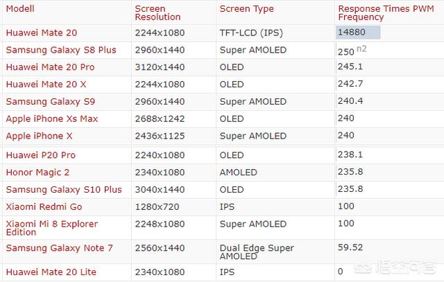 notebook-check网站上有一个 PWM 排行,里面有手机和笔记本电脑屏幕的频闪频率,包括LCD和LED,我截取了几个设备的数值大家可以参考下。