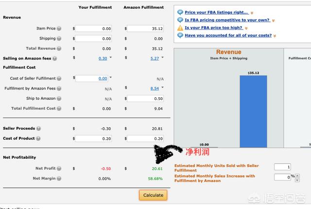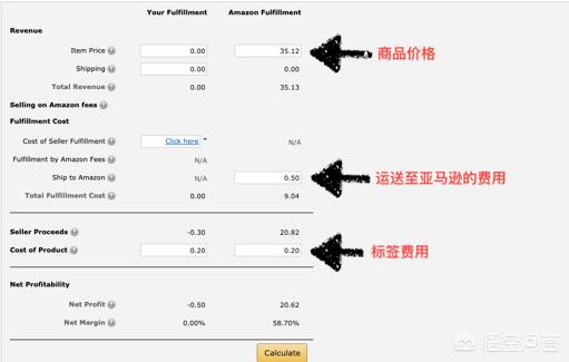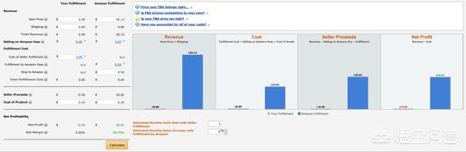3、把价格信息填进Your Fulfillment或者Amazon Fulfillment,点击右下角的calculate就可以出结果了