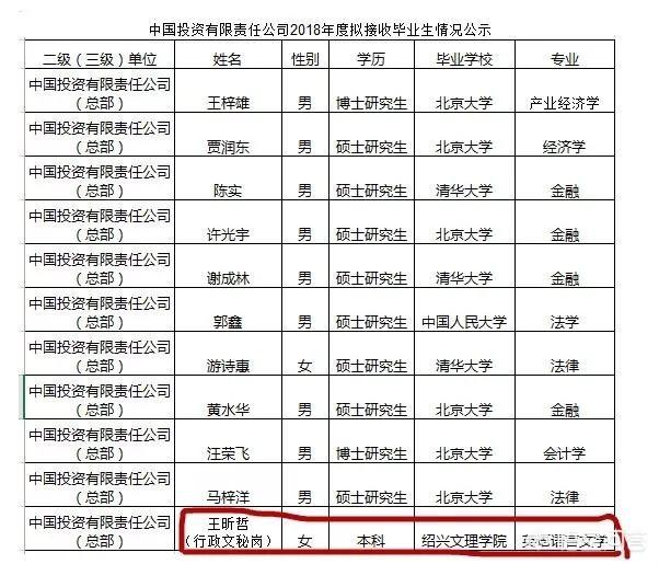 一家注册资本金2000亿美元的国有独资公司,一次面向境内毕业生的校园招聘,拟聘用的结果是10名清华大学和北京大学的硕博研究生和1名普通院校绍兴文理学院的本科生,这样的结果引发网友广泛关注。