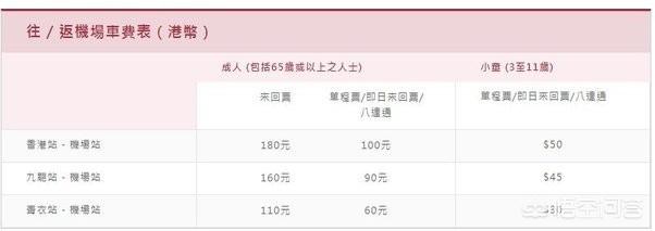 实际是机场铁路,但外形和内部装饰看上去就是地铁。机场快线全长35.3公里,旅客由机场前往中环市中心约需24分钟。共有“博览馆”、“机场”、“青衣”、“九龙”和“香港”5个站,但大部人都只会用到机场、九龙、香港三个站(你要用的是九龙站)。列车服务时间为早上5:54至第二天凌晨0:48(由机场站开出),每12分钟一班车。使用八达通或团体票价格会优惠一些,下图是官方的报价,价格是港元。不过我给大家提供一个更便宜的方法:在淘宝上买https://s.click.taobao.com/uah5jpw,以机场至香港站为例,淘宝单程票只卖55RMB。