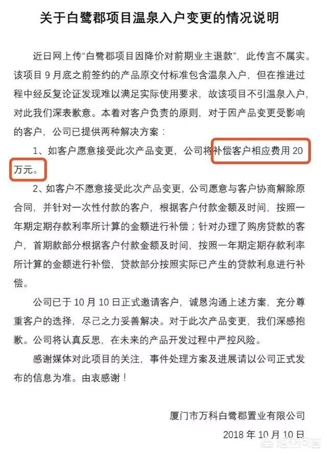 不过,10月10日晚,厦门万科在微信公众号上公告辟谣了,称自己给出的一种解决方案是给客户退款20万元,另一种则是解除合同并给予利息补偿。