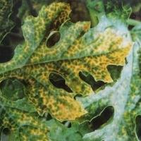 叶片上病斑黑褐色,圆形或不规则形,其上有不很明显的同心轮纹,叶缘老病斑上有小黑点,病叶干枯呈星状破裂,果实上初期产生水渍状病斑,中央变褐色枯死斑,呈星状开裂,引起瓜腐烂。
