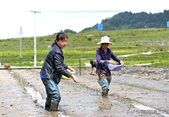 田间还要施肥料,碳胺,机械打田使土壤松软成泥浆状之后,第二天均匀播种子,搞完之后,再把田里的水放干。
