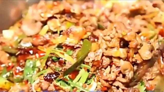 锅里剩余的油把花椒、大蒜、干辣椒爆香。
