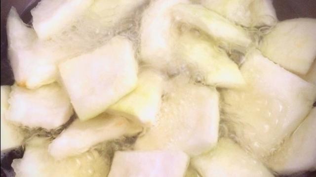 2、用刀削掉柚子皮表面青皮,入锅煮出苦水,倒出用清水漂洗至无黄水,再捞出挤干水分,改刀切成一寸4公分的菱形块。酸红辣椒切丁,酸姜切大片,大蒜切小片,香葱切段;