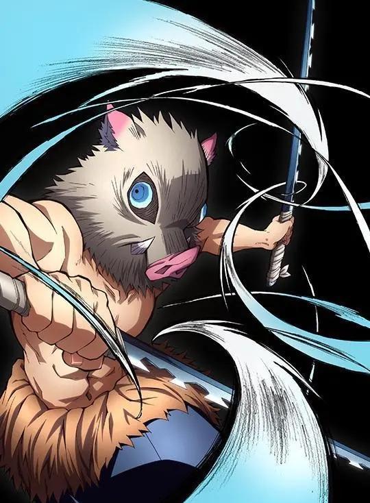 伊之助是一位和炭治郎同期的鬼杀队剑士。戴着灰色的山猪头面具,腰部及腿部都有皮毛装饰,上半身赤裸,只有下半身穿着鬼杀队的队裤的腹肌美少年。面具之下漂亮的脸蛋只要他不说话,就没人知道她是男的。