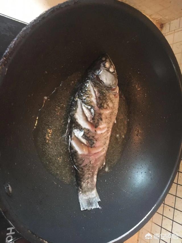 锅留底油,待油温6成热时,放入鲫鱼,小火慢慢煎制,同时晃动炒锅使鱼均匀受热。