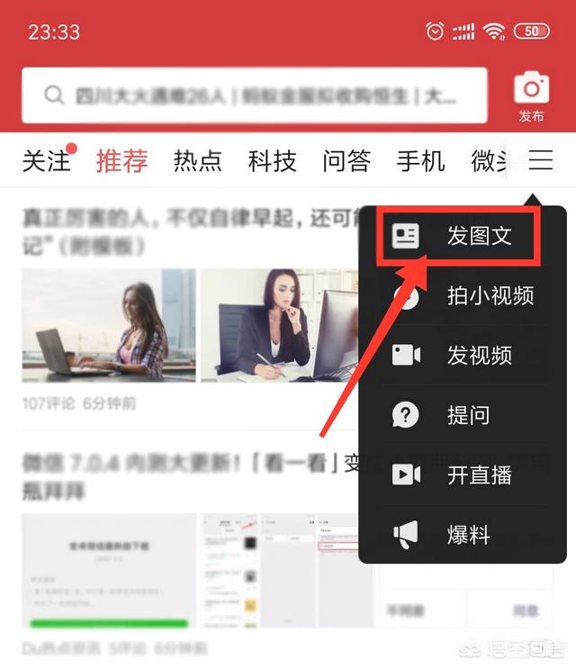 然后,点击后会出来一个菜单,第一项就是“发图文”,这里就可以进入到发布微头条的编辑模式了: