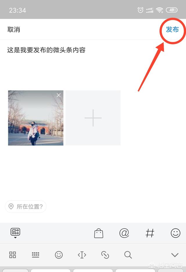 接着,就可以开始编辑你的发布内容了,类似于朋友圈,编辑问题,选择好要发布的图片,单张多张都可以,还可以选择位置等等,编辑完成后就可以点击右上角“发布”按钮即可完成。