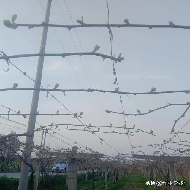 猕猴桃第四年可以确定架形,果园要选T型架还是大棚架要开始引导结果枝。第四年春天,结果母枝上发出的新梢以中心铅丝为中心线,沿架面向两侧生长,采用T型架的,新梢超出架面后会自然下垂。