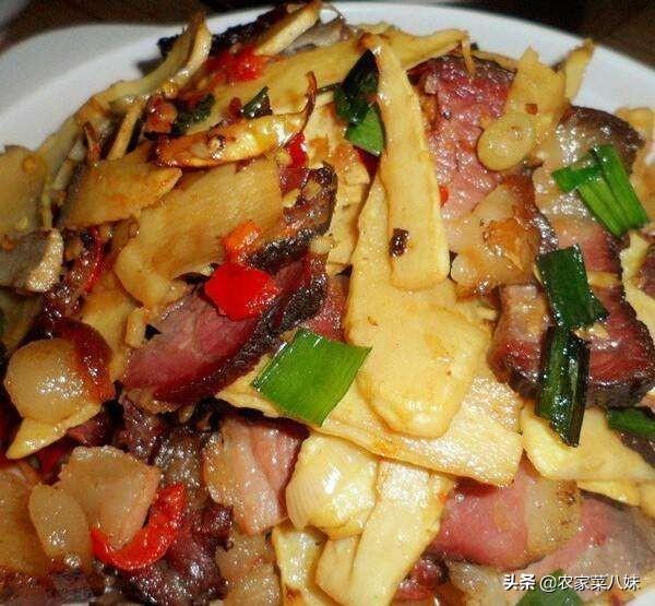 柴火腊肉是云贵川,湖南最有代表性的特产之一!它的特点是油而不腻,瘦而不柴 ,吃上一口鲜香回味无穷!决对是吃了还想吃!腊肉它的做法有很多,水煮的,清蒸的,爆炒的,麻辣的等……那么我现在教大家做一道简单而又家常美味的冬笋炒腊肉分享给大家。第一准备一块肥瘦相间的腊肉,准备一个火枪把腊肉的皮烧至起泡,当然煤气灶上烧也可以,不过得用夹子夹住腊肉免得烧到手,为什么要烧皮呢,一是可以去掉肉皮上的猪毛跟腥味。二是经过大火烧后吃起来皮更软,香。烧皮烧好之后放热水准备一把刀把皮上的黑色用刀削掉,把腊肉反复清洗干净,之后把腊肉切成一片一片的装盘备用。第二:准备一个锅烧水,水开之后把切好的腊肉下锅焯水至三分钟左右,捞起装盘备用。第三:把冬笋去皮切成片也焯水准用,切记冬笋焯水的时候放点盐那样一起煮去腥,冬笋更鲜入味,冬笋水焯好捞出备用,锅洗干净热锅冷油,油温烧至七成热放腊肉下锅煸,煸至腊肉出油放生姜,大蒜头片,少许干辣椒段一起炒出香味放冬笋一起翻炒放盐一小勺,生抽少许,鸡精半小勺,切记翻炒过程中尽量不要加水,那样炒出来的冬笋腊肉更香,等翻炒出菜的香味放点蒜苗翻炒两下就可以出锅装盘了,就这样一道营养又美味的冬笋炒腊肉就做好了!