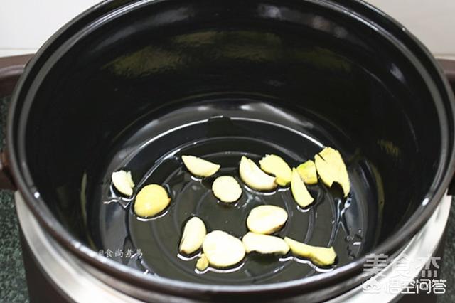 电炖锅通电,选择红烧功能键,倒入食用油,加热片刻后倒下蒜片和姜片