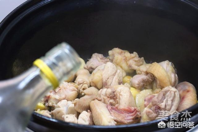 炒至鸡肉表面发白,鸡皮紧缩,再烹入料酒