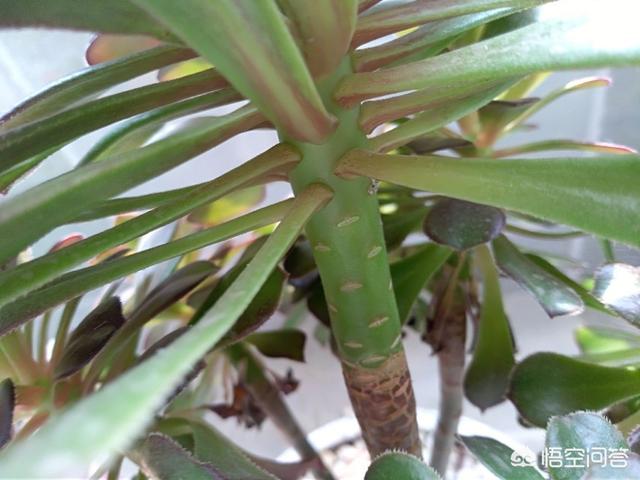 这是我养的黑法师,很明显可以看到叶片下面有一截茎是绿色的,这是从去年到今年长高了这么多。顶上长了新叶,下面的老叶就慢慢干枯脱落了。
